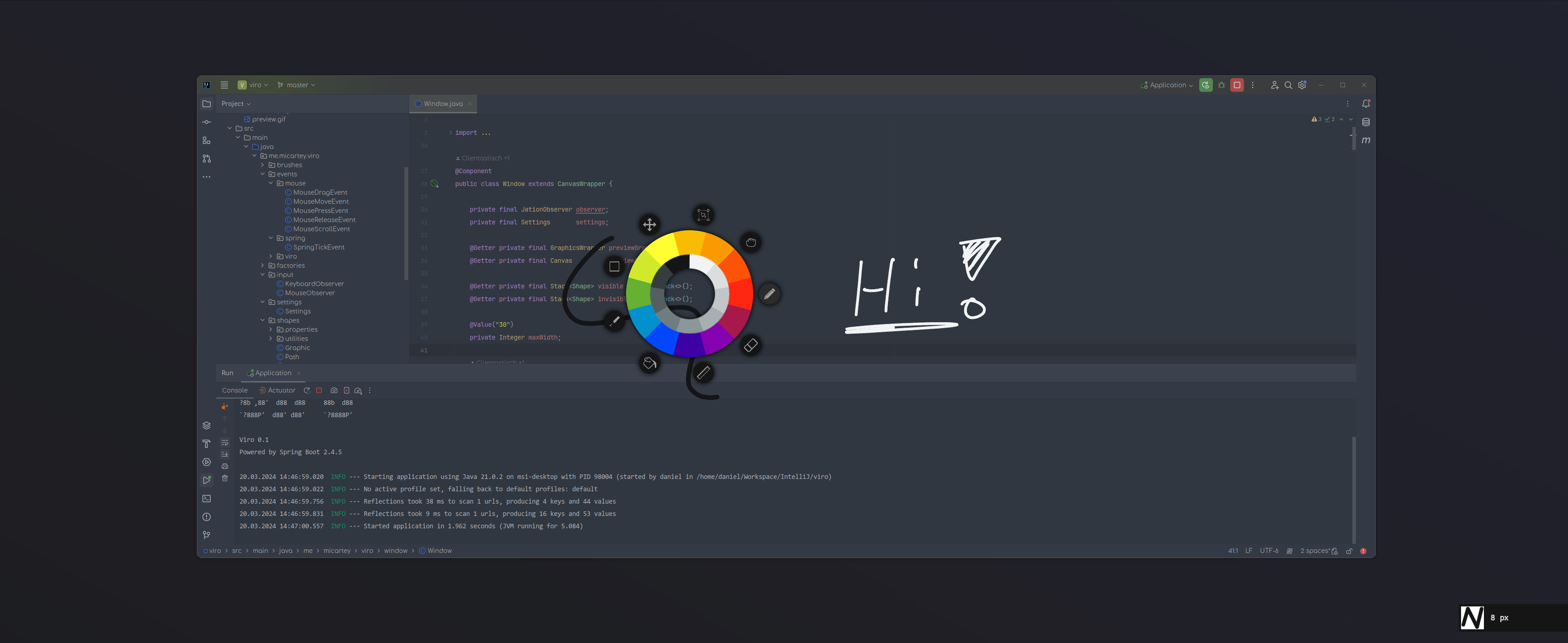 viro is a java overlay doodle application meant to quickly draw and highlight things in screen sharings or recordings. It is implemented in JavaFx and builds on the Spring Boot framework.